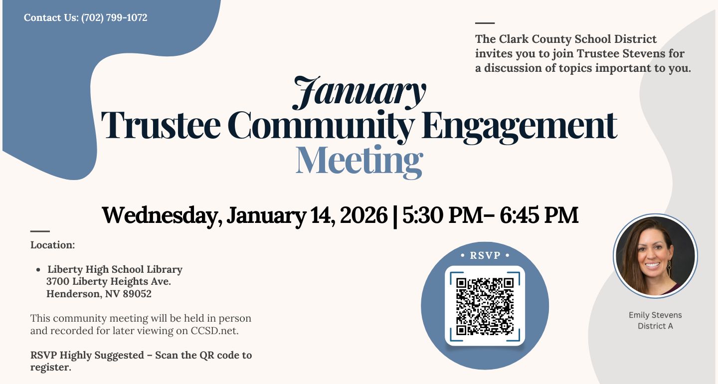 The Clark County School District (CCSD) is inviting families to attend an upcoming community engagement meeting with Trustee Emily Stevens to discuss topics important to you.